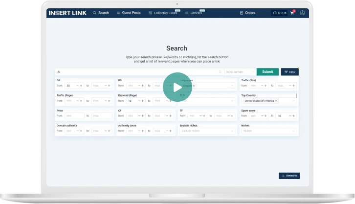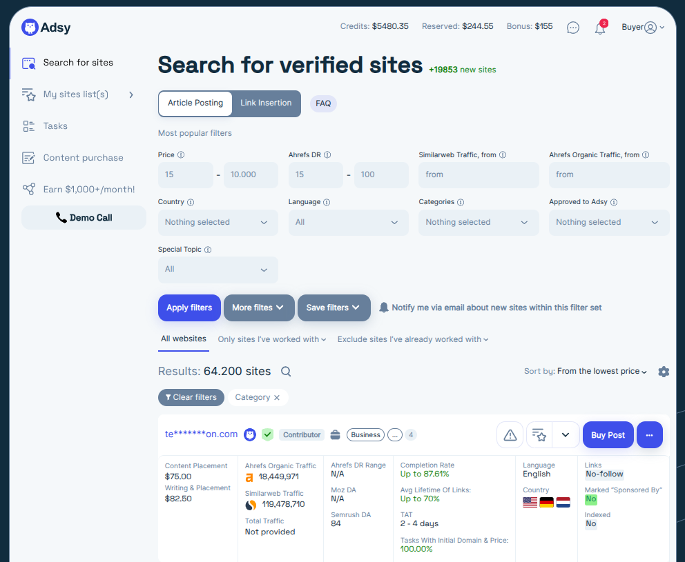 What’s good: INSERT.LINK uses Google’s NLP to let you search by topic instead of manually filtering — a genuinely useful feature when you’re looking for contextually relevant placements. The database covers 40+ countries with 152 locations, making it strong for geo-targeted campaigns. They also offer placements on major media outlets like AP News and Reuters, which is rare among self-serve marketplaces.